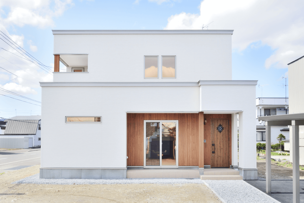 1.白を基調に本物の木材をアクセントに配色した外観デザイン。