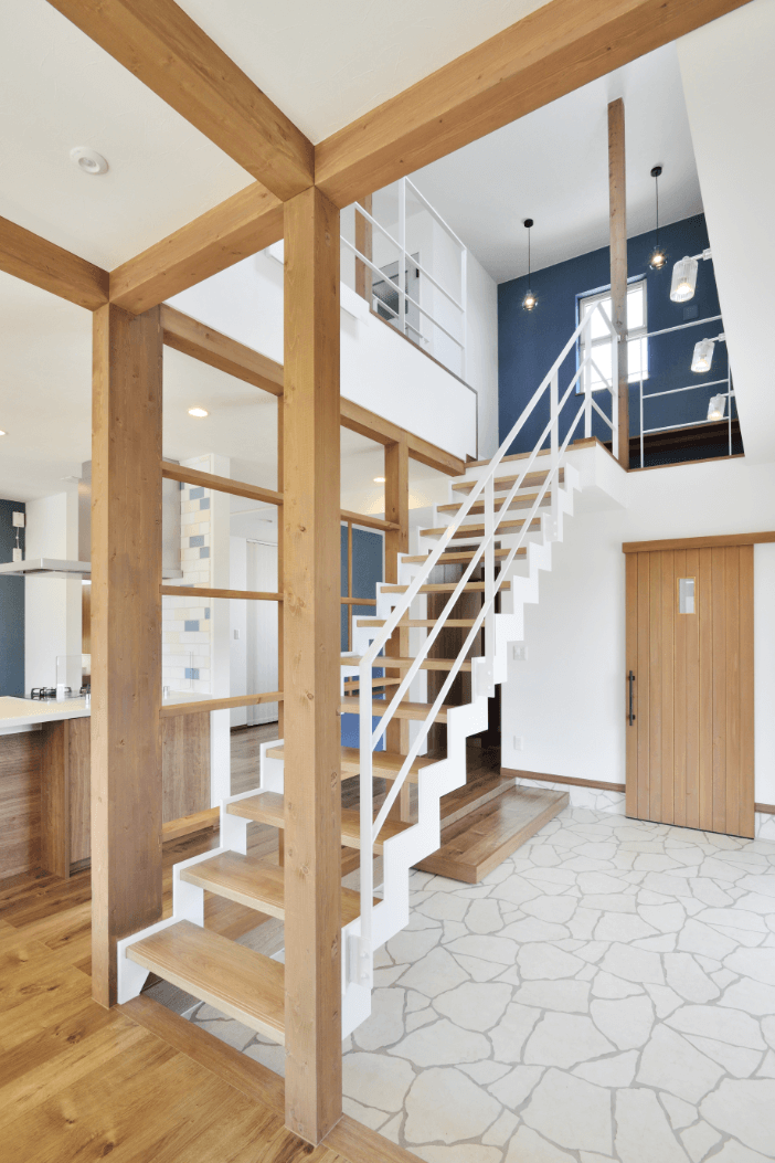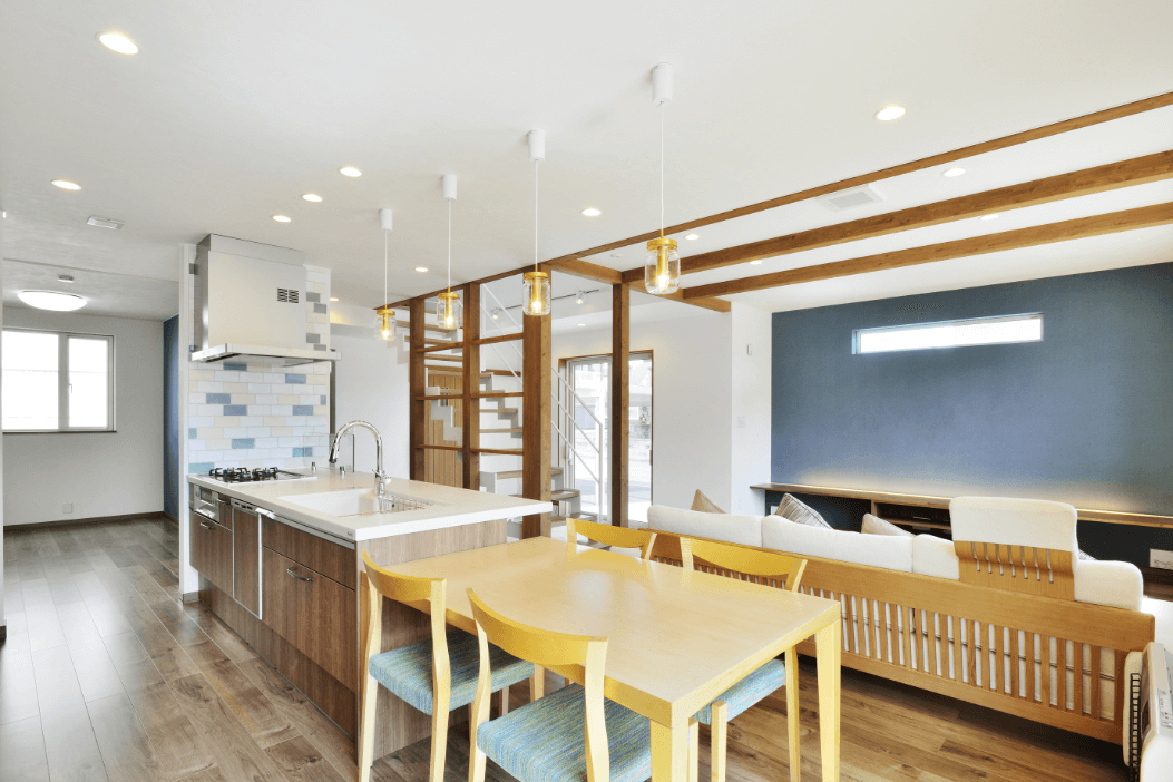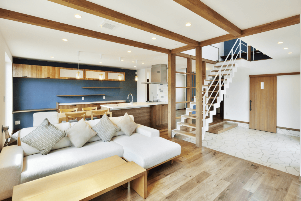 2.天井の梁を生かし木材の色合いとブルーを配色したリビング。