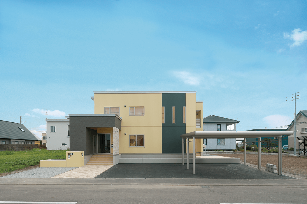 1.イエローとグリーン、明るいカラーリングのデザイン。室内と同じガラスブロックがアクセントになり、玄関回りをいっそう引き立てています。