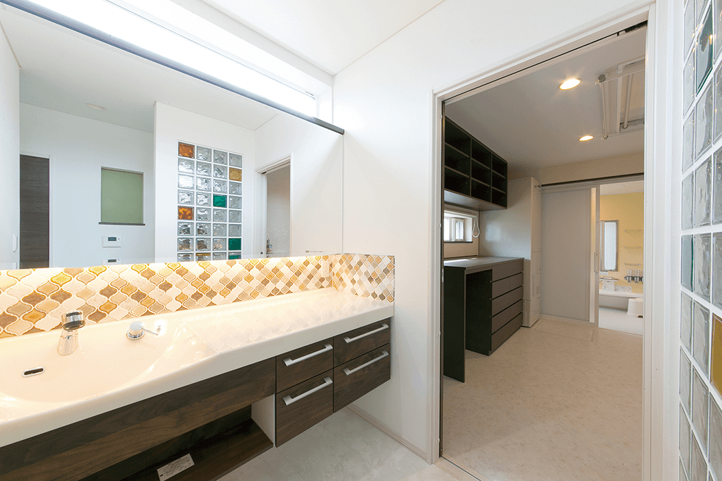 3.洗面コーナーから洗濯脱衣室。ここで着替えが済むようにゆったりと設計しました。