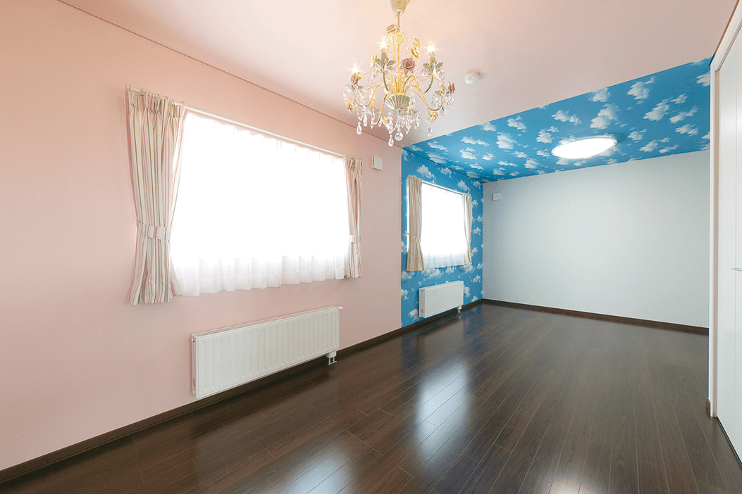 4.お子様達の部屋はピンクと空模様のクロス。