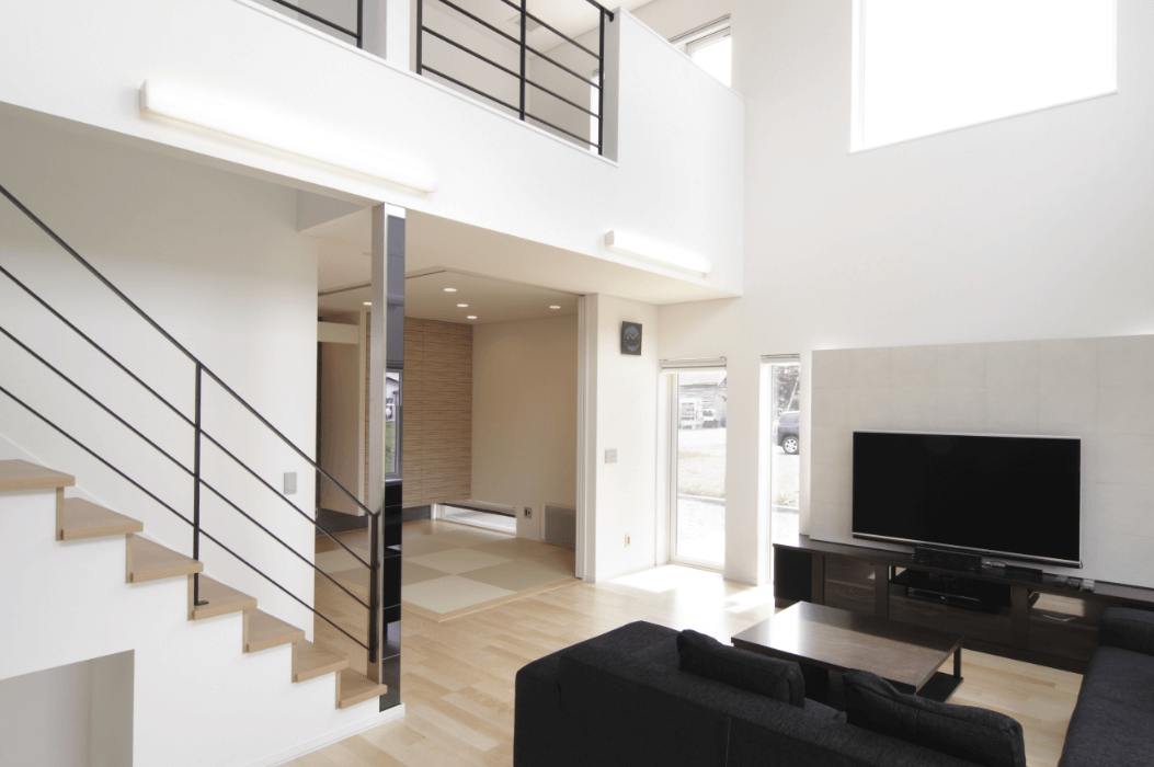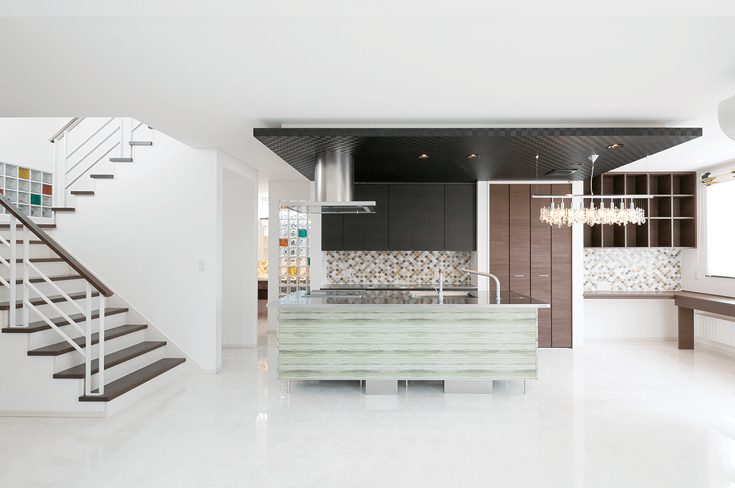 2.大きな吹抜けが広がる、家族のための開放的なくつろぎの住まい。1階は階段を中心とした機能的な回遊式の動線で、豪華なアイランドキッチンをセット。さらに隣接する和室をオープンにすることで、より伸びやかな空間を実現しています。